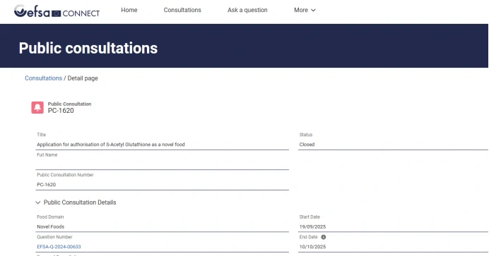 根据欧盟官方披露的公开咨询文件(PC-1620),EFSA 已拟议批准 S-乙酰-L-谷胱甘肽作为新型食品(Novel Food)进入市场 。这意味着 SAG 在欧洲市场从“法规空白”迈向了“合法合规”的关键一步 。